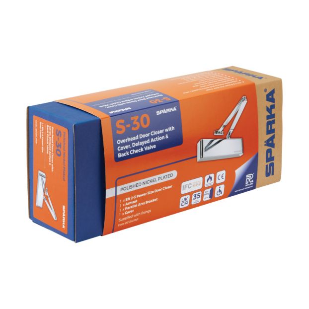 The Sparka S-30 Overhead Door Closer is an EN variable power size 2-5 door closer making it suitable for doors upto 1250mm wide / or maximum 110Kg. This door closer comes complete with mechanism, cover, armset, parallel arm bracket for mounting on the 'Push' face of the door, installation template and all fixings. The closer has integrated adjustable valves to independently control the closing and latching speeds. Also with integrated Back Check valve which provides a cushioning effect for when the door opens too fast and integrated Delayed Action valve to provide a delayed closing to help assist the passage of wheel chair, push-chair or less-abled users. It is suitable for timber fire doors up to 60 minutes, and steel fire doors upto 240 minutes. The product has been indepently tested to meet and exceed fire door testing requirements and is backed by a 35 year guarantee for peace of mind.